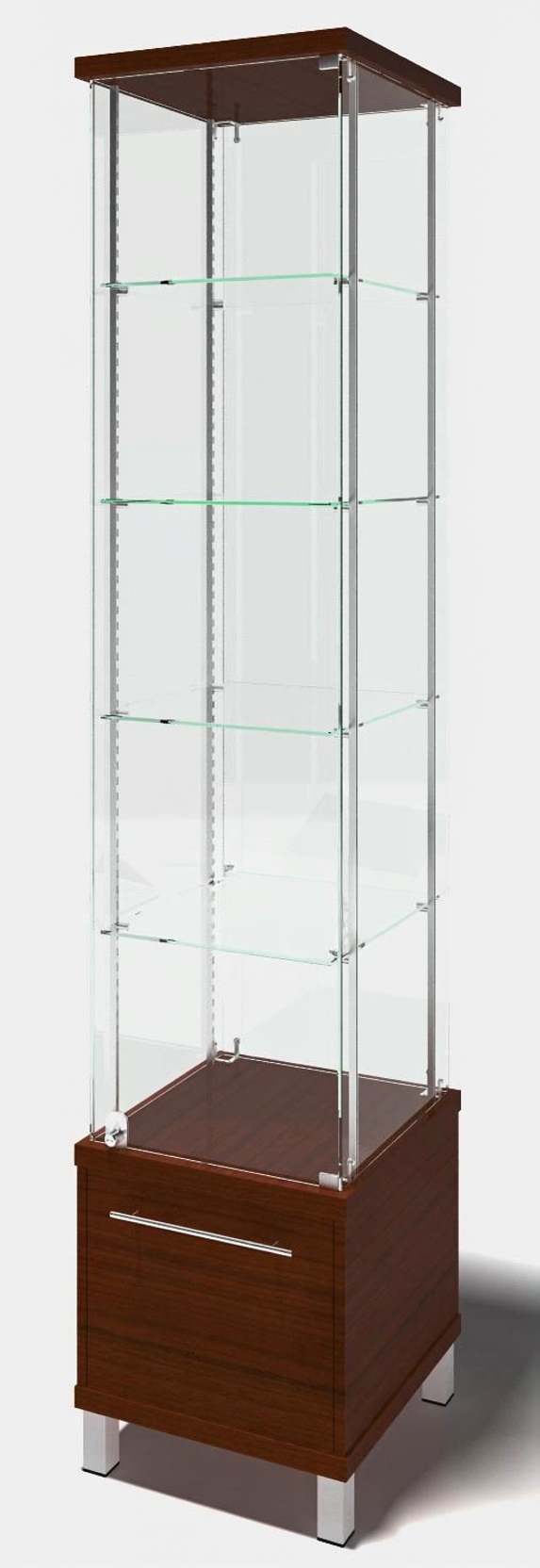 Витрина К-45Т. Габариты: 450х470х2150 мм. 4 стеклянные регулируемые полки на перфорированных направляющих (стекло 6 мм). Выдвижной ящик. Топы ЛДСП 32 мм Дверки стеклянные - с замком. Опоры Н=100 мм. Возможно изготовление по индивидуальным размерам. Вес -67 кг, транспортировочный объем -0,1 м3