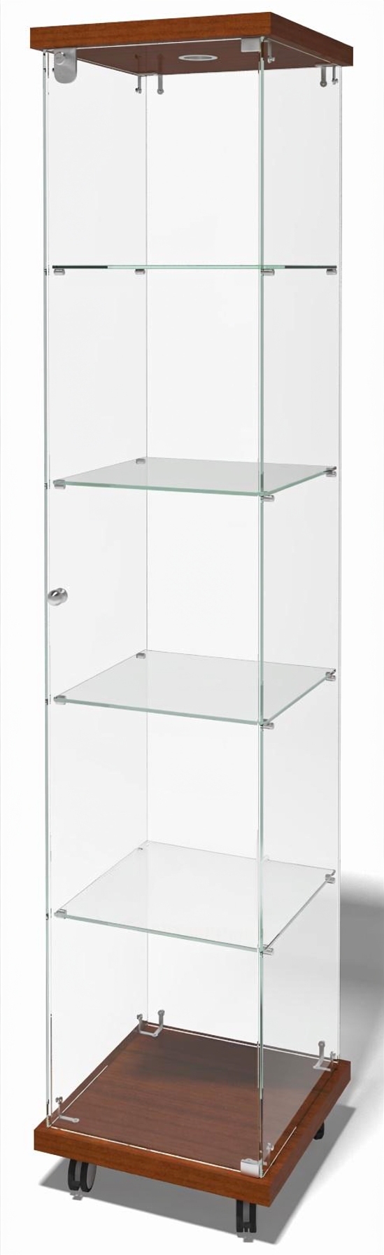 Витрина 4/18L. Габариты: 400х400х1830мм. Основание и крыша - ЛДСП 32 мм (кромка ПВХ - 2мм),боковины, дверка, задняя стенка в демонстрационной части - 5 мм стекло марки М1. Витрина укомплектована 1 точечным светодиодным светильником. В демонстрационной части -4 стеклянные полки 6 мм. По запросу витрины могут комплектоваться колесными опорами (стандартная комплектация -регулируемые опоры высотой 100 мм). Витрина поставляется в разобранном, упакованном виде. Вес витрины -58 кг, транспортировочный объем -0,1 м3. Возможно изготовления витрин по индивидуальным размерам.