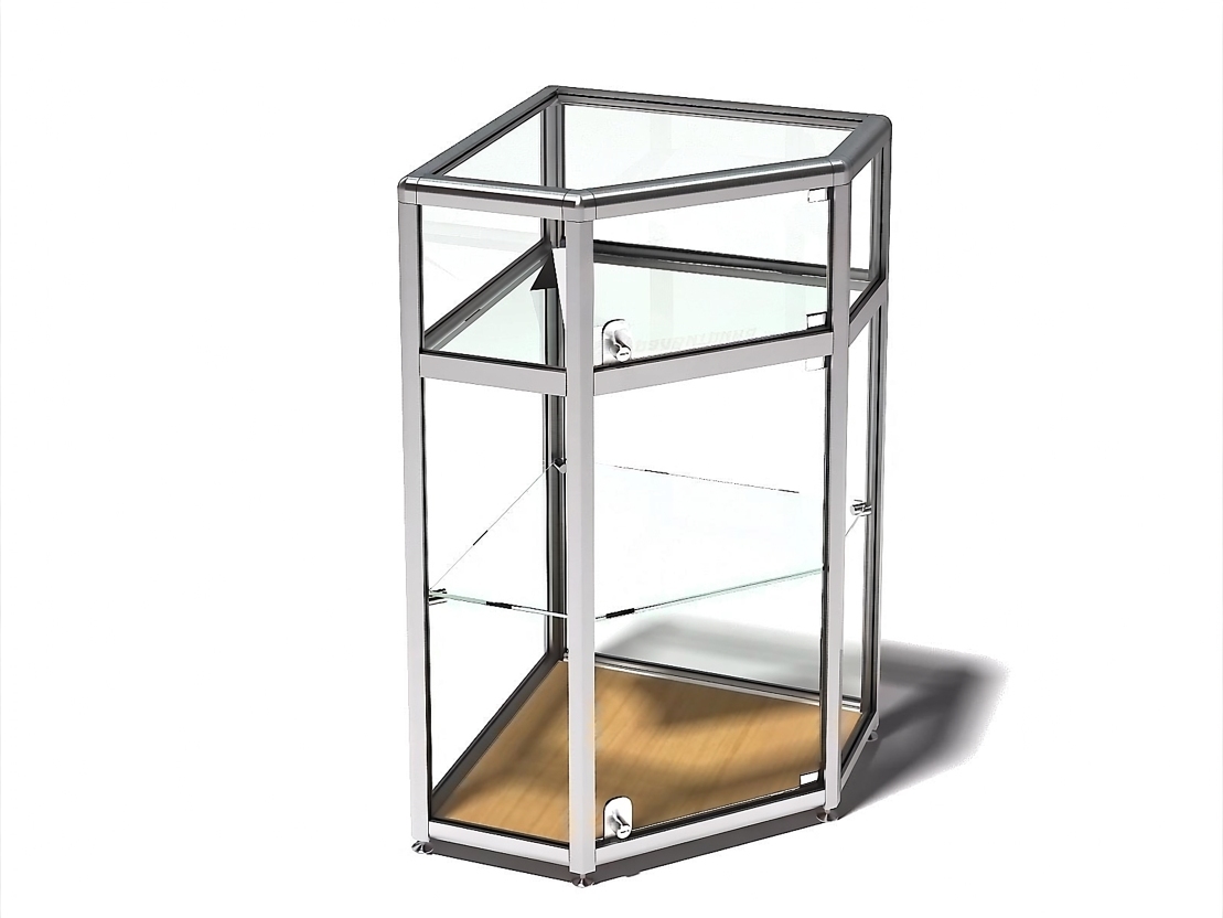 Прилавок демонстрационный угловой ПДА-01/05у аквариум ,профиль - анодированный (возможна покраска по каталогу RAL), заполнение - ЛДСП (цвет - по выбору). габариты 500х500х900 мм. Высота демонстрационной части -200 мм. 1 стеклянная полка (6 мм) Поставляется в упакованном виде. Возможно изготовление в нестандартных размерах.Стеклянные дверцы с замками.