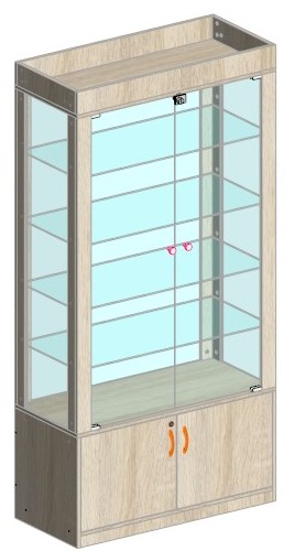 Витрина Т-100ВД. Габариты: 1000х450х2000 мм. Накопитель Н=500 мм. Дверки стеклянные 5 мм c замками. Комплектуется подсветкой (2 точечных светодиодных светильника). 4 стеклянных полки толщиной 6 мм. Боковины и задняя стенка -стекло 4 мм. Возможно изготовление витрин по индивидуальным размерам. Поставляется в упакованном виде. Вес витрины-105 кг, транспортировочный объем -0,12 м3