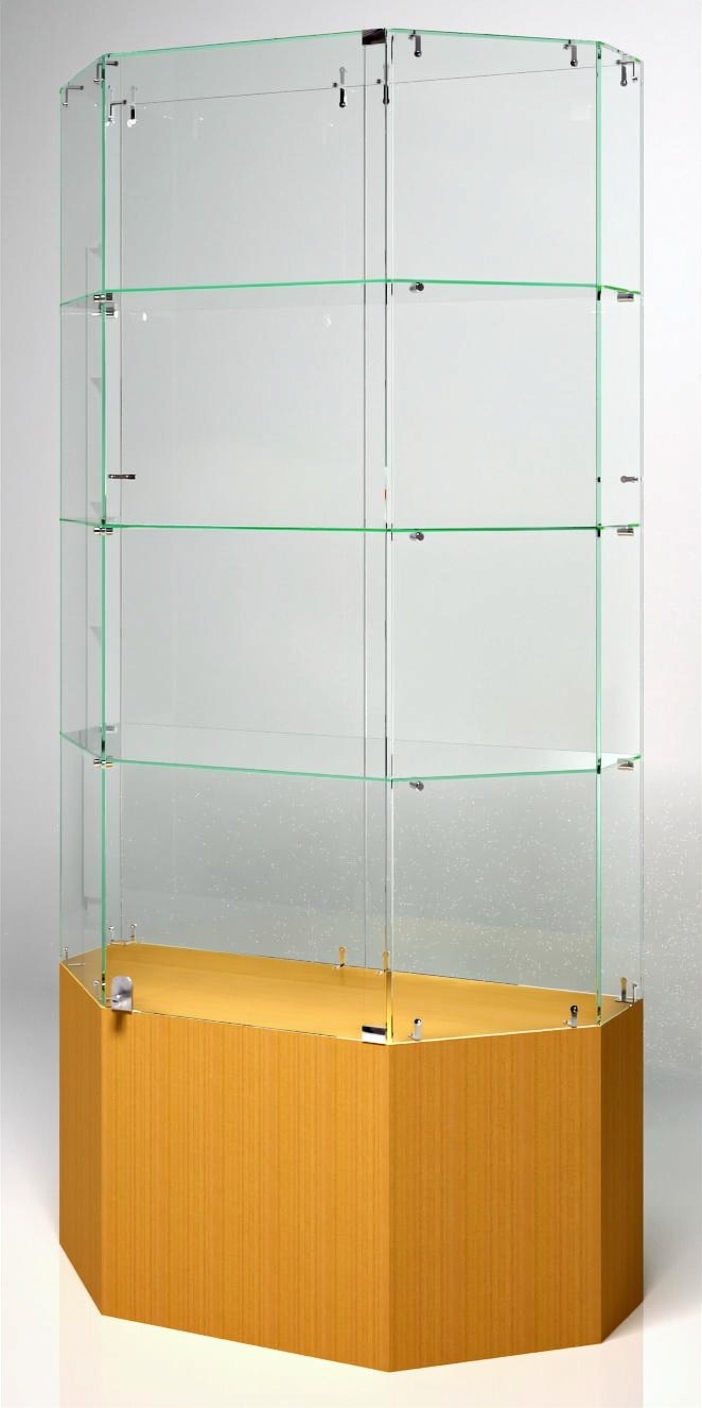 Витрина В-102ВВ. Габариты: 1020х450х2050 мм. Подиум- 500 мм. Витрина со стеклянной дверкой (укомплектована замком). Крыша-стекло. 3 нерегулируемых стеклянных полки (стекло-6 мм). Цвет подиума - на выбор. Возможно изготовление витрин по Вашим размерам. Поставляется в упакованном виде .Вес витрины составляет -102 кг, объём 0,11 куб.м. Количество упаковок -4 штуки. Трапецевидная форма витрины (со скошенными углами). Такая форма демонстрационной конструкции эффективна в плане демонстрации и продаж , так как дает возможность лучше осмотреть выставленный на полках товар или экспозицию.