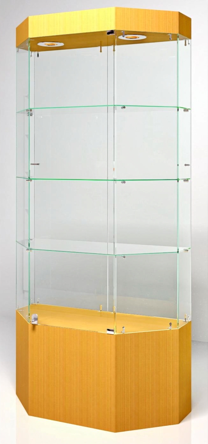 Витрина В-104ВВ. Габариты: 1020х 450х 2150 мм. Подиум- 500 мм. Дверки,боковины, задняя стенка демонстрационной части - стекло 5 мм. Цвет подиума - на выбор. Возможно изготовление витрин по Вашим размерам. в демонстрационной части -3 стеклянных нерегулируемых полки (стекло 6 мм). Верхний козырек (фриз) укомплектован подсветкой (2 точечных светодиодных светильника). Поставляется в упакованном виде .Вес витрины составляет -110 кг, объем 0,1 куб. м. Количество упаковок -4 штуки. Трапецевидная форма витрины (со скошенными углами). Такая форма демонстрационной конструкции эффективна в плане демонстрации и продаж , так как дает возможность лучше осмотреть выставленный на полках товар или экспозицию.
