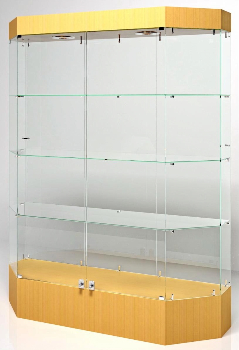 Витрина В-154ВН. Габариты: 1520х 450х 1900 мм. Подиум- 250 мм. Дверки,боковины, задняя стенка демонстрационной части - стекло 5 мм. Цвет подиума - на выбор. Возможно изготовление витрин по Вашим размерам. в демонстрационной части -3 стеклянных нерегулируемых полки (стекло 6 мм). Верхний козырек (фриз) укомплектован подсветкой (2 точечных светодиодных светильника). Поставляется в упакованном виде .Вес витрины составляет -112 кг, объем 0,1 куб. м. Количество упаковок -5 штук. Трапецевидная форма витрины (со скошенными углами). Такая форма демонстрационной конструкции эффективна в плане демонстрации и продаж , так как дает возможность лучше осмотреть выставленный на полках товар или экспозицию.