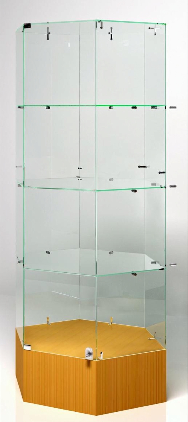 Витрина В-62. Габариты: 600х690х1800мм. Подиум- 250 мм. 3 стеклянных нерегулируемых полки (стекло 6 мм), стеклянная дверца с замком. Цвет подиума - на выбор. Витрина имеет шесть граней, что создает возможность рассмотреть экспозицию со всех сторон. ОБычно размещается в центральной части помещения.